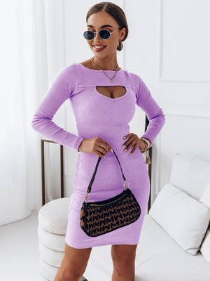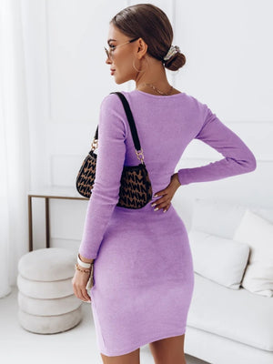 Purple Round Neck Solid Long Sleeves Bodycon Polyester Above Knee Dress