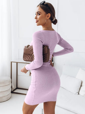 Purple Round Neck Solid Long Sleeves Bodycon Polyester Knee Length Dress
