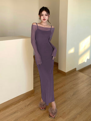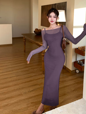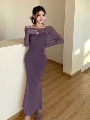 Purple Shoulder Straps Solid Sleeveless Maxi A-Line Polyester Dress