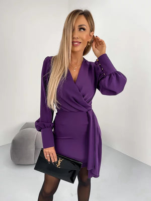 Crafted with attention to detail, this purple v-neck solid long sleeves bodycon polyester above knee dress features a solid purple color that exudes elegance and sophistication. Pair it with heels and statement accessories for a glamorous evening ensemble or dress it down with flats for a more casual yet stylish outfit.