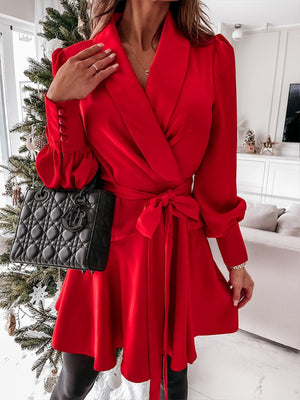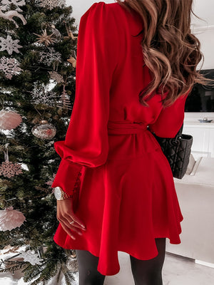This elegant red halter neck fit and flare party solid long sleeves above knee polyester dress features a flattering V-neckline and A-line silhouette, perfect for any party or special occasion. With long sleeves and an above knee length, this dress is a versatile and chic addition to any wardrobe.