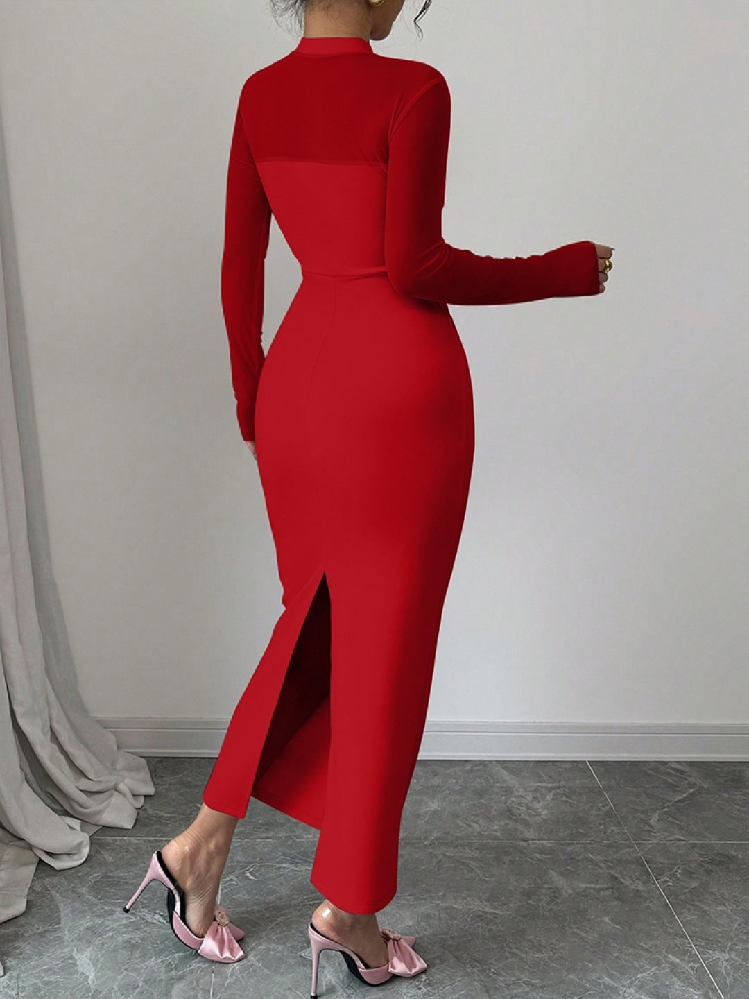 Red High Neck Solid Long Sleeves Midi Bodycon Polyester Dress
