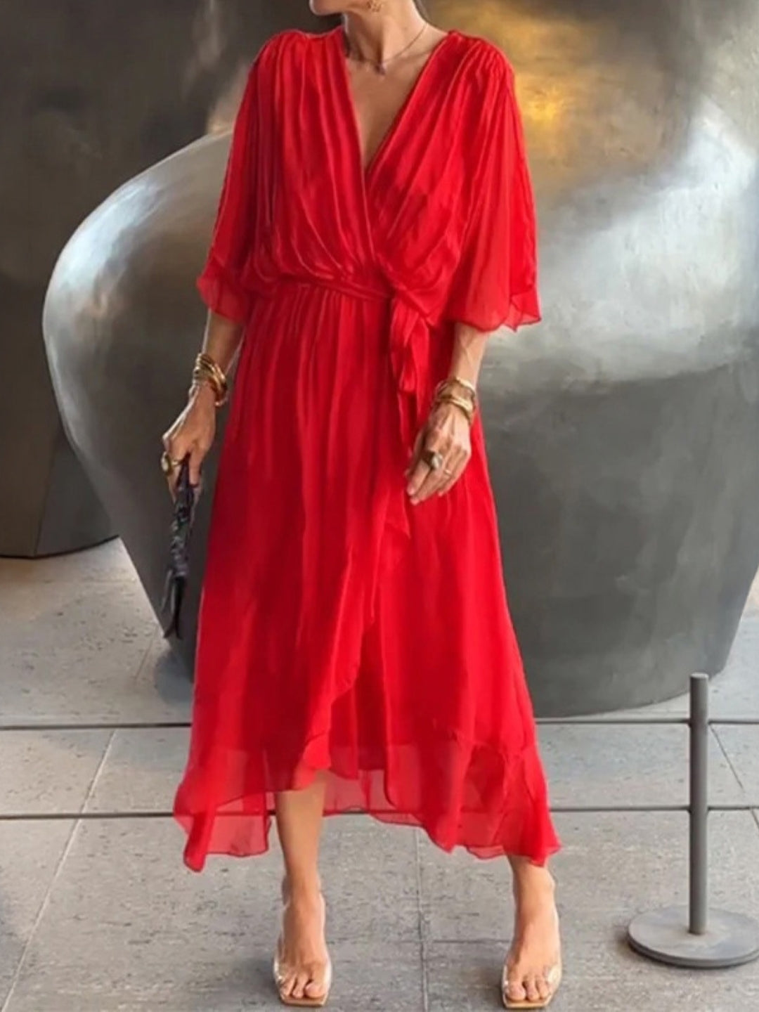 Elevate your style with this elegant green V-neck midi dress, designed with a flowy silhouette and a flattering tie waist. Featuring soft lightweight fabric and half sleeves, this dress is perfect for both casual outings and special occasions. Pair it with heels or sandals for a chic and versatile look.
