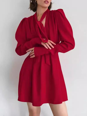Stand out in this striking red long sleeve mini dress, designed with soft puff shoulders and a tie-neck detail that adds a touch of elegance. Perfect for date nights, parties, or festive occasions, this dress combines sophistication with a bold pop of color. Pair with heels and minimal jewelry for a timeless, chic look.
