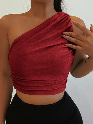 Introducing our Red One Shoulder Sleeveless Polyester Top, a stylish and versatile addition to your wardrobe. Made from high-quality polyester fabric, this top offers a comfortable and breathable fit. The one shoulder design adds a touch of elegance, while the black color provides a timeless and sophisticated look.