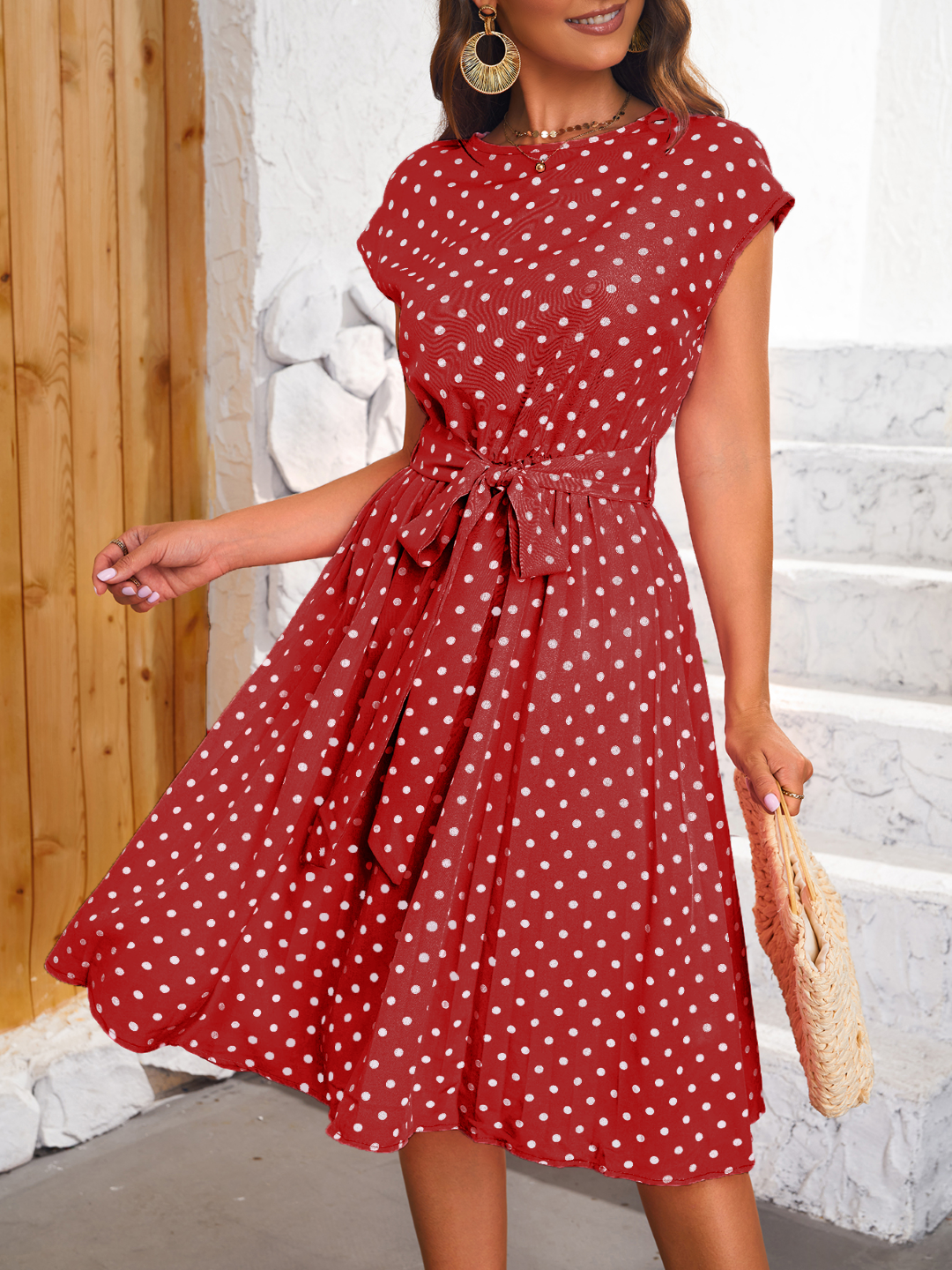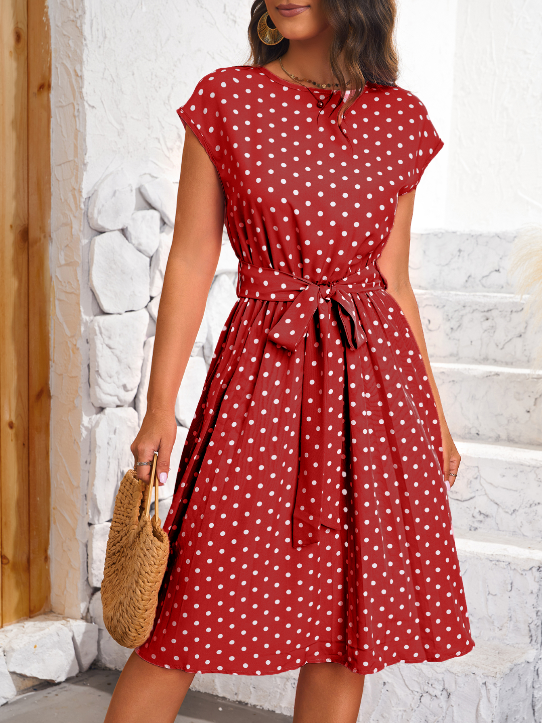 Red Round Neck A-Line Polka Dots Short Sleeves Knee Length Polyester Dress