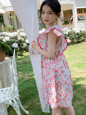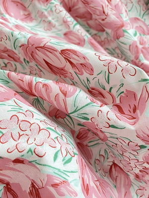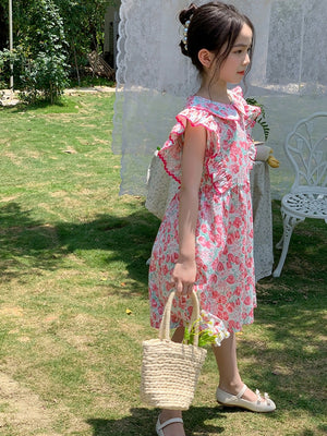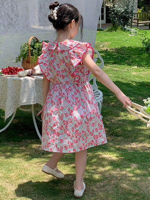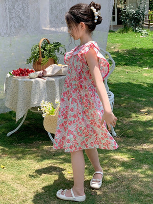 Red Round Neck Casual A-Line Floral Cotton Knee Length Dresses