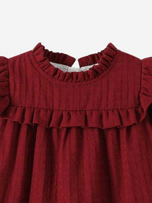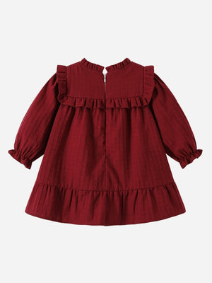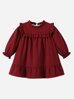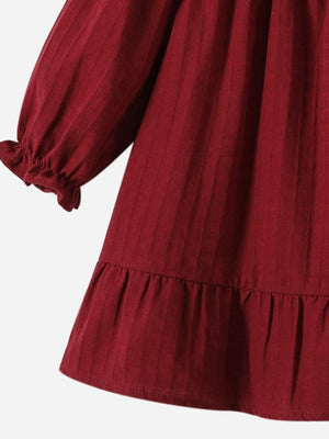 Red Round Neck Casual A-Line Solid Long Sleeves Knee Length Cotton Dress