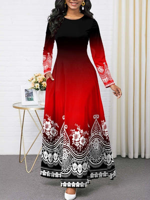 Red Round Neck Ethnic Motifs Long Sleeves A-Line Polyester Maxi Dress