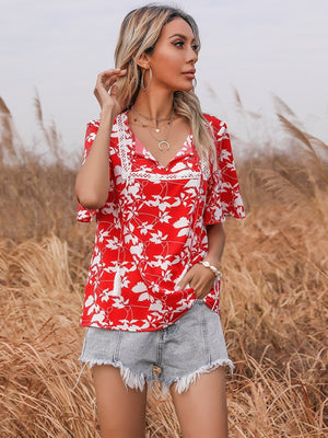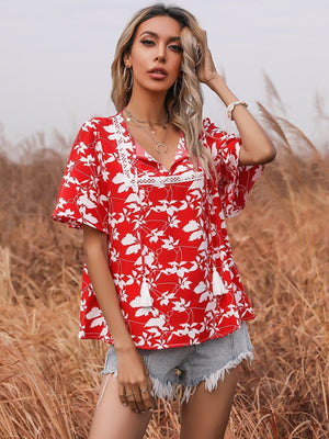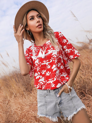 Introducing our Red Round Neck Floral Short Sleeves Polyester Top, a stylish and versatile addition to your wardrobe. Made from high-quality polyester fabric, this top offers a comfortable and breathable fit. The round neck design adds a touch of elegance, while the black color provides a timeless and sophisticated look.