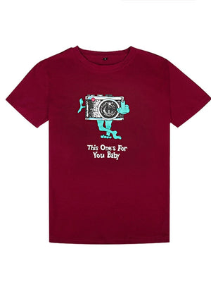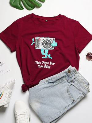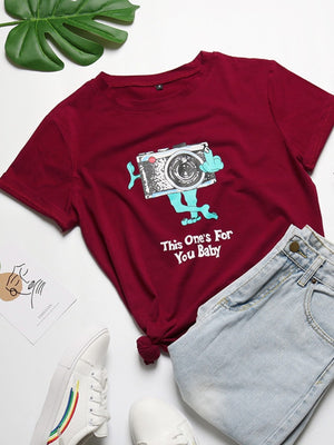 Red Round Neck Graphics Short Sleeves Cotton Top