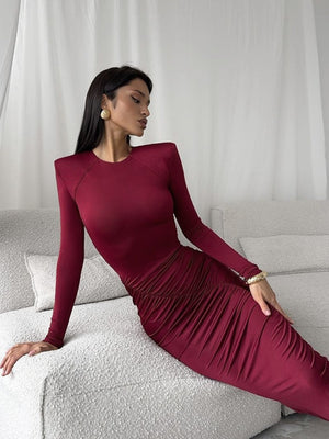 Red Round Neck Solid Long Sleeves Maxi Bodycon Polyester Dress