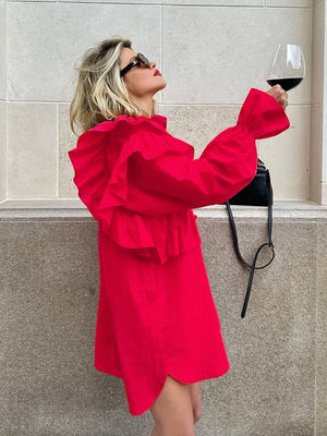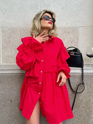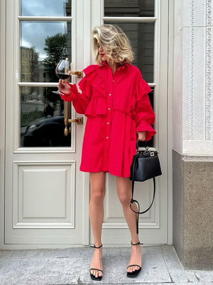 Turn heads with our Red Ruffled Button-Down Shirt Dress, a stunning fusion of effortless structure and feminine flair. Featuring a statement red hue, dramatic ruffled sleeves, and a relaxed yet cinched silhouette, this dress is perfect for brunches, city strolls, or wine nights with friends. The button-down front adds a chic tailored touch, while the voluminous sleeves and flowy skirt keep it fun and fashion-forward. Style it with oversized sunglasses and heels or sneakers for a look that? unapologetically bold and confident.