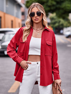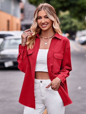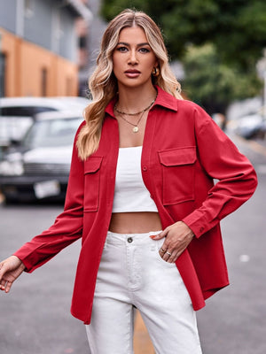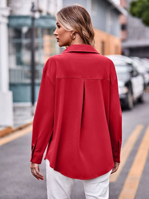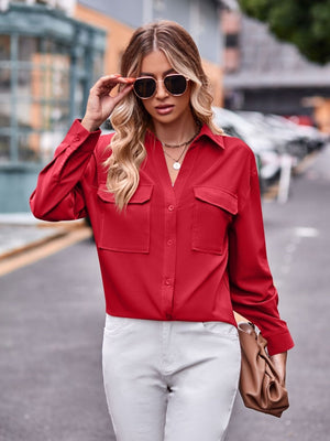 Red Shirt Collar Long Sleeves Solid Polyester Top