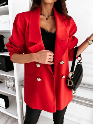 Red Shirt Collar Solid Three-Quarter Sleeves Polyester Top