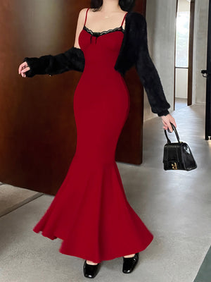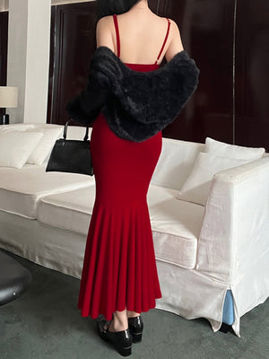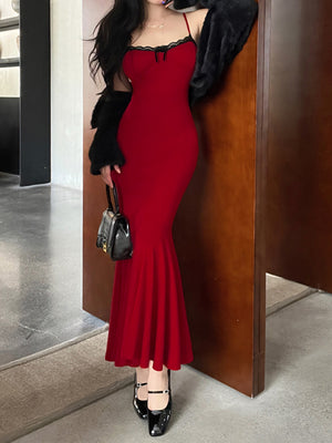 Red Shoulder Straps Solid Sleeveless Maxi A-Line Polyester Dress