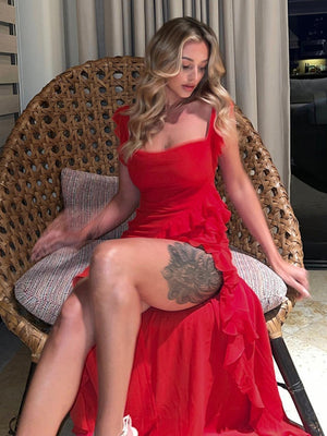 This elegant red maxi dress features a classic square neck and sleeveless, making it a versatile and timeless addition to any wardrobe.