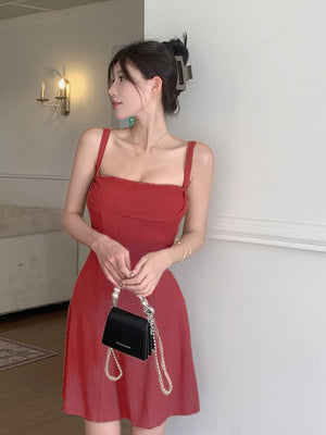 Red Square Neck Sleeveless Solid Polyester A-Line Dress