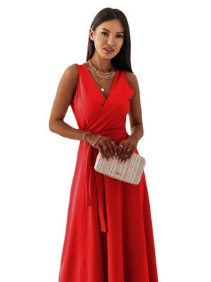 Red V-Neck A-Line Sleeveless Solid Maxi Polyester Dress