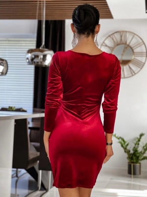 Red V-Neck Bodycon Long Sleeves Solid Above Knee Polyester Dress