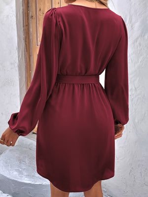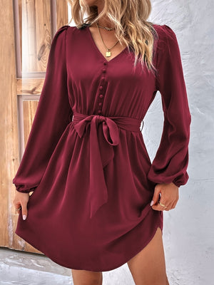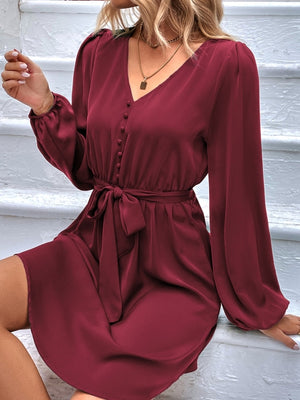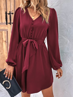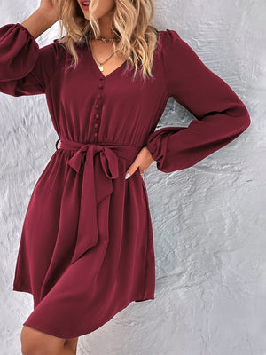 Red V-Neck Solid Long Sleeves Polyester Dress