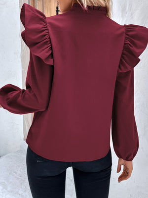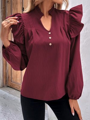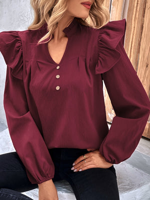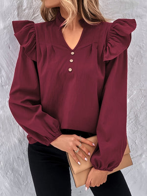 Introducing our Red V-Neck Solid Long Sleeves Polyester Top, a stylish and versatile addition to your wardrobe. Made from high-quality polyester fabric, this top offers a comfortable and breathable fit. The v-neck design adds a touch of elegance, while the black color provides a timeless and sophisticated look.