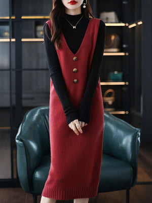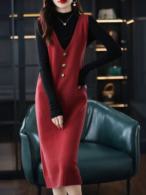 Red V-Neck Solid Sleeveless Midi Sheath Acrylic Dress