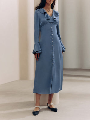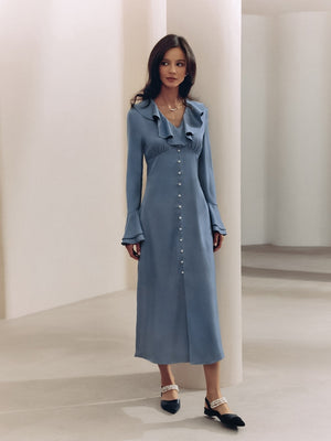 Step into timeless elegance with our Ruffle Collar Button-Down Midi Dress in Blue. Featuring romantic ruffle detailing at the neckline and cuffs, this dress exudes vintage charm with a modern twist.