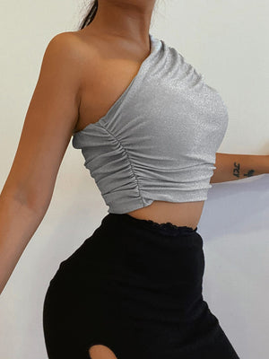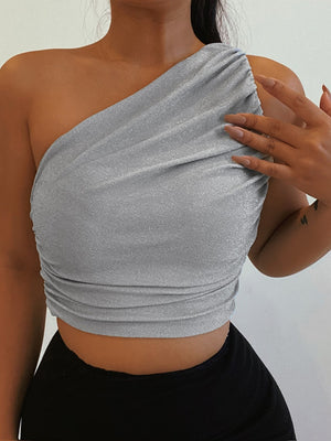 Silver One Shoulder Solid Sleeveless Polyester Casual Top