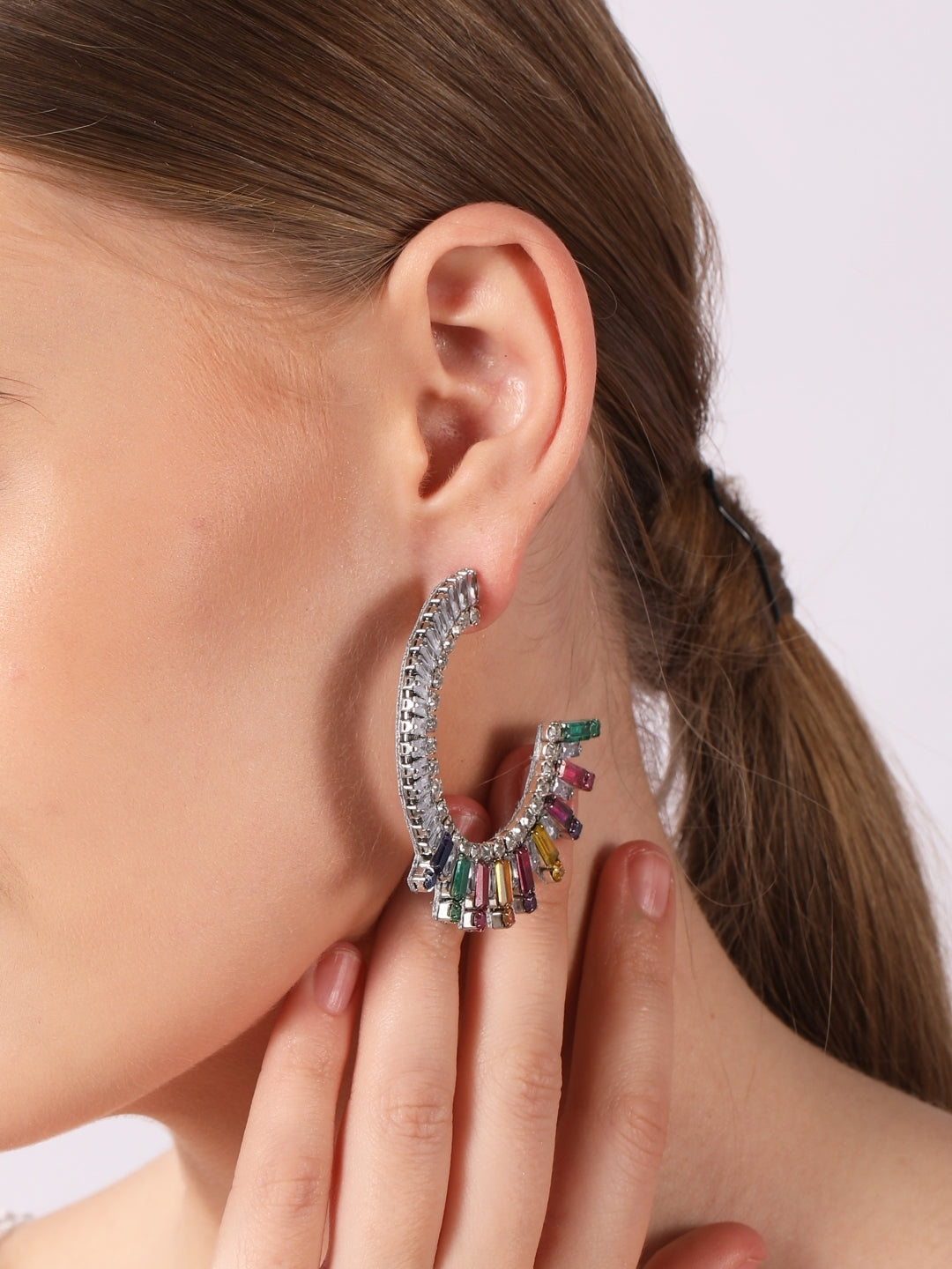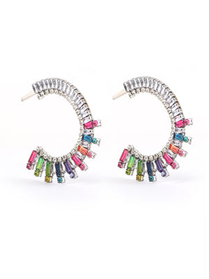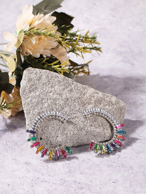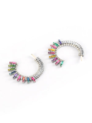 Silver-Plated Silver Rhinestone Studded Brass Handcrafted Half Hoop Earrings