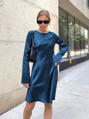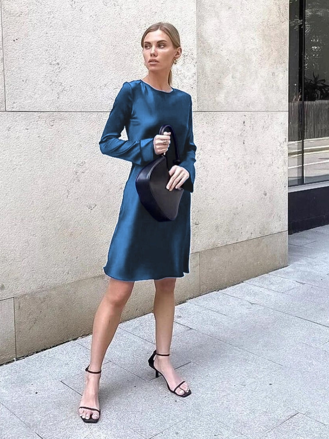 Make an effortlessly chic statement with this teal satin shift dress, featuring a smooth silky finish, long sleeves, and a relaxed yet refined silhouette. Ideal for both daytime sophistication and evening elegance.