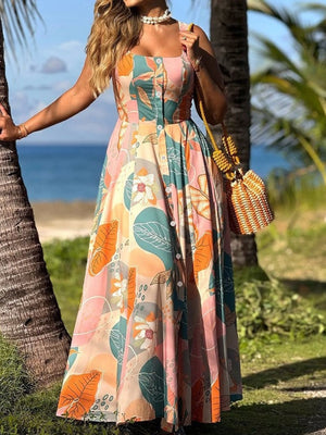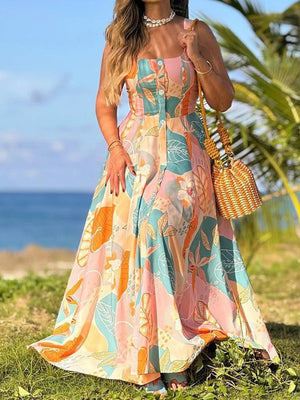 Step into summer with our Tropical Breeze Button Down Maxi Dress, the ultimate statement piece for sun-drenched days and beachside getaways. This eye-catching maxi features a colorful patchwork-inspired tropical print in vibrant shades of coral, aqua, peach, and orange. Designed with a flattering square neckline, button-down front, and a flowing A-line silhouette, it offers both style and comfort. The lightweight, breathable fabric and sleeveless cut make it ideal for warm-weather adventures.