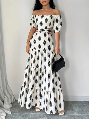 Elevate your summer wardrobe with the White & Black Off-Shoulder Cutout Maxi Dress ?a statement piece that blends elegance with a touch of bold flair. Designed with a stunning off-shoulder neckline and detailed black embroidery-style patterns, this dress exudes modern femininity. Featuring side cutouts that subtly accentuate the waist and a flowy tiered maxi skirt, this dress is both flattering and comfortable. The puff sleeves and stretchy neckline add a romantic feel, while the monochrome palette keeps it effortlessly chic.