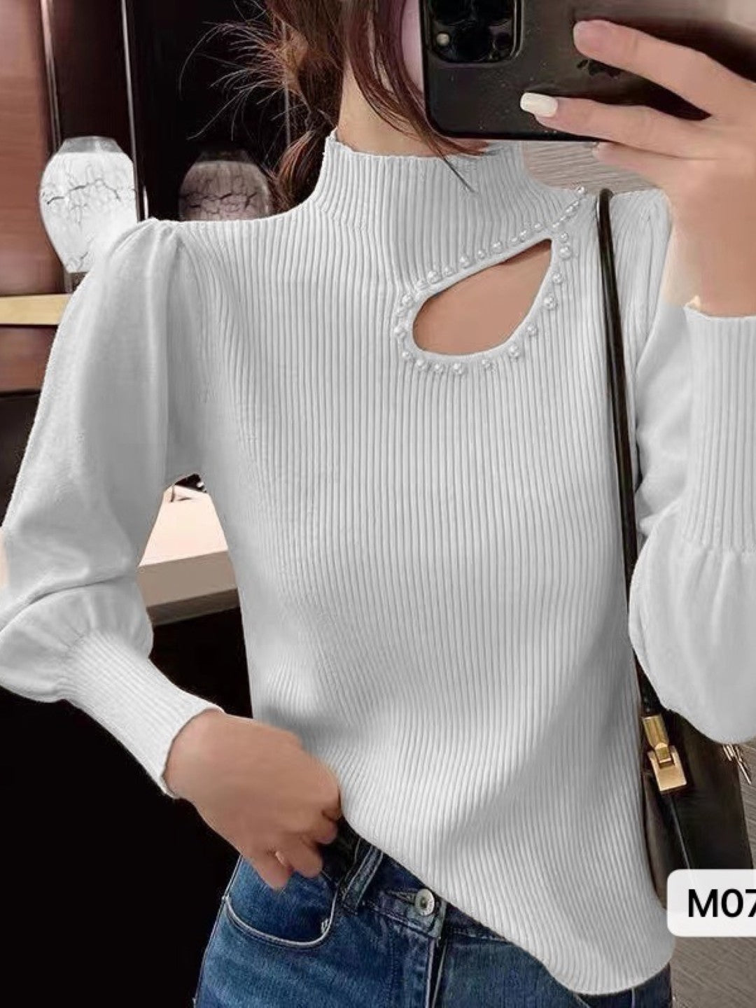White High Neck Long Sleeves Solid Regular Sleeves Viscose Rayon Top