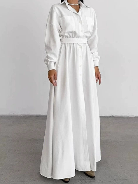 Step into effortless elegance with this white long sleeve maxi shirt dress. Designed with a classic collared neckline, button-down front, and a defined waistline, it combines timeless tailoring with modern sophistication. The flowing maxi length adds a graceful touch, making it suitable for both casual and formal occasions.