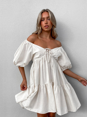 White Off-Shoulder Puff Sleeve Babydoll Dress