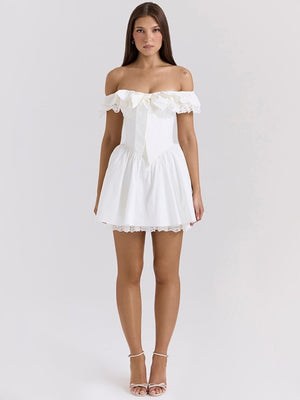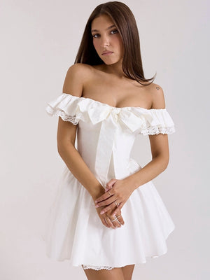 Sweet, romantic, and effortlessly feminine ?the White Off-Shoulder Ruffle Mini Dress is the perfect pick for your next brunch, summer date, or celebration. This dreamy dress features a structured bodice with a soft off-shoulder ruffle neckline and a flared mini skirt with lace trim. The bow-tie front adds a dainty detail, making this piece feel like modern-day fairytale fashion.