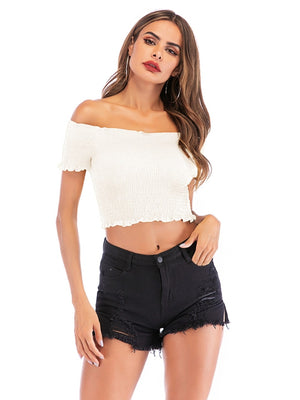 White Off-Shoulder Solid Short Sleeves Polyester Crop Top