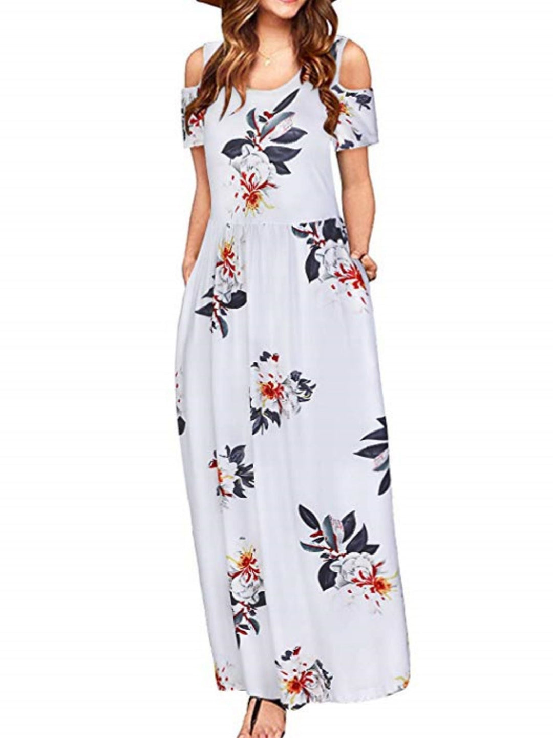 White Round Neck A-Line Solid Short Sleeves Maxi Polyester Dress