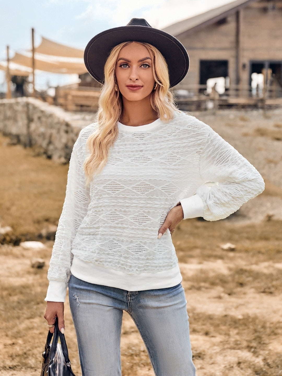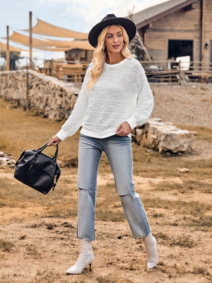 White Round Neck Long Sleeve Polyester Top