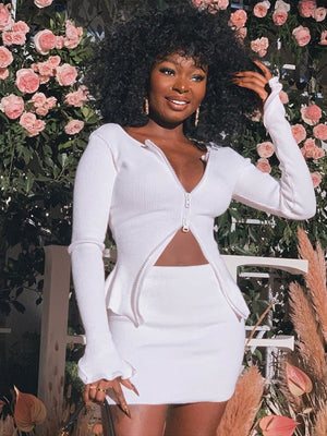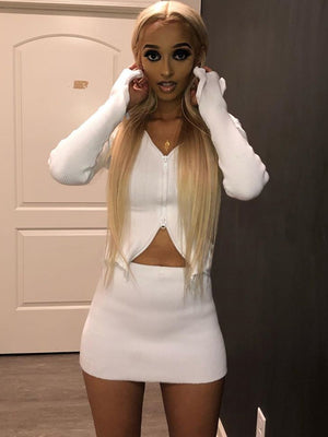 White Round Neck Long Sleeves Polyester Top & Skirt Set