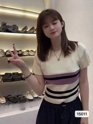 Introducing our White Round Neck Short Sleeves Horizontal Stripes Regular Sleeves Viscose Rayon Top, a stylish and versatile addition to your wardrobe. Made from high-quality viscose rayon fabric, this top offers a comfortable and breathable fit. The round neck design adds a touch of elegance, while the black color provides a timeless and sophisticated look.