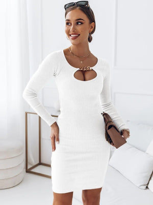 White Round Neck Solid Long Sleeves Bodycon Polyester Knee Length Dress
