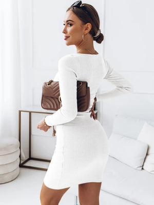 Crafted with attention to detail, this white round neck solid long sleeves bodycon polyester knee length dress features a solid white color that exudes elegance and sophistication. Pair it with heels and statement accessories for a glamorous evening ensemble or dress it down with flats for a more casual yet stylish outfit.