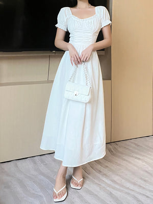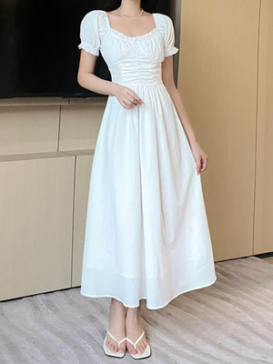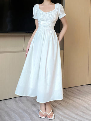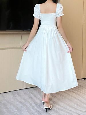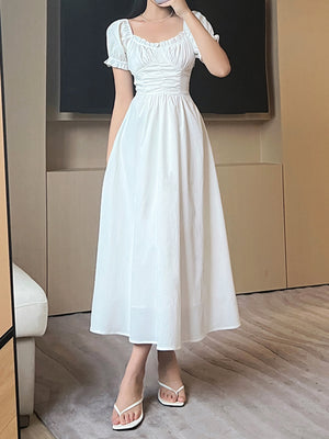 White Round Neck Solid Short Sleeves Maxi A-Line Polyester Dress