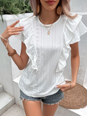 Introducing our White Round Neck Solid Short Sleeves Polyester Top, a stylish and versatile addition to your wardrobe. Made from high-quality polyester fabric, this top offers a comfortable and breathable fit. The round neck design adds a touch of elegance, while the black color provides a timeless and sophisticated look.