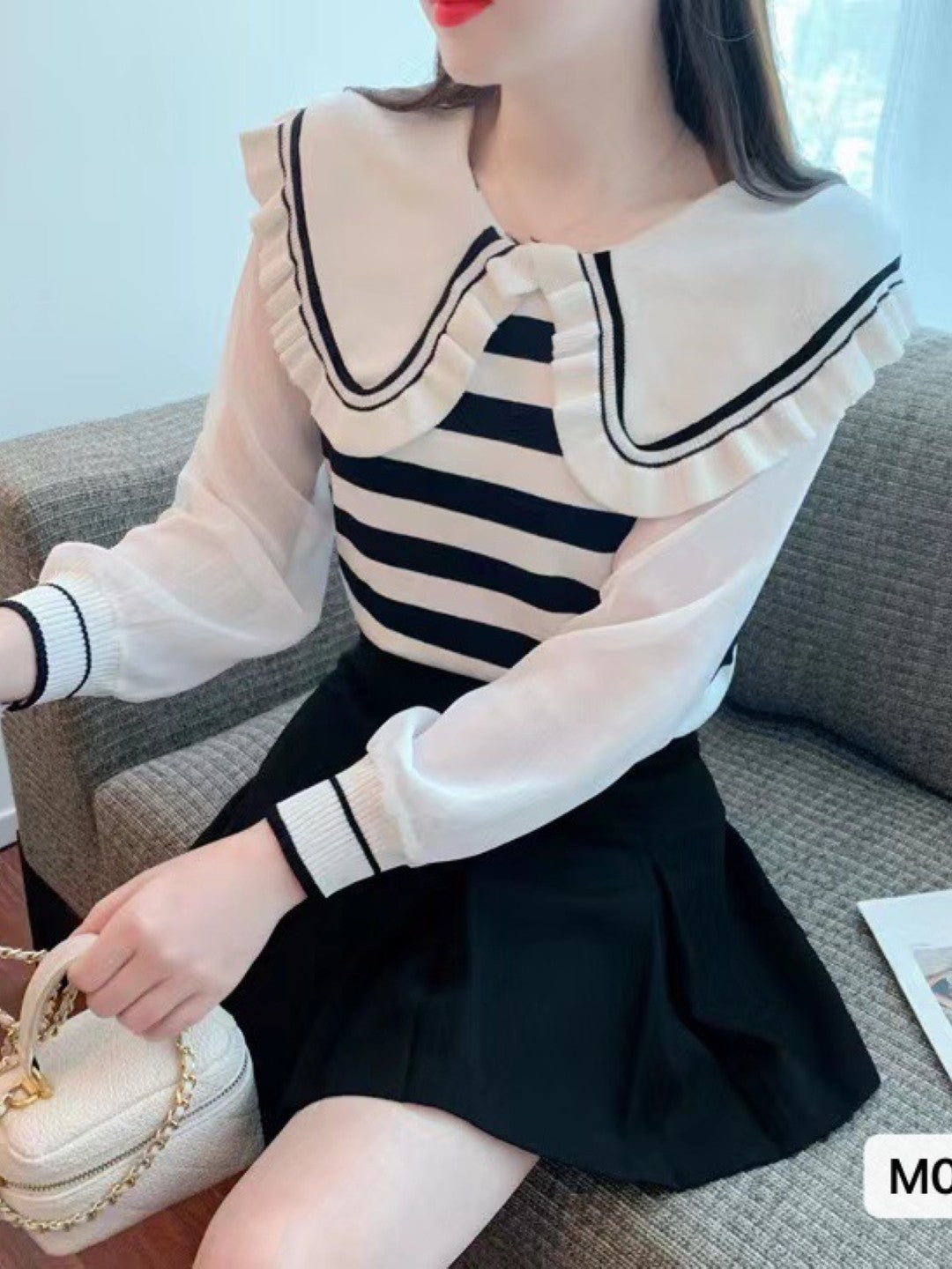 White Shirt Collar Long Sleeves Horizontal Stripes Top