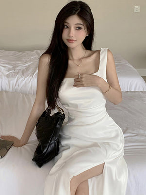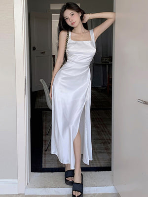 White Square Neck Solid Sleeveless Maxi Bodycon Polyester Dress