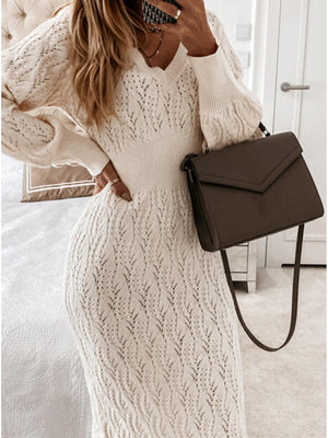 White V-Neck Bodycon Party Solid Long Sleeves Knee Length Polyester Dress