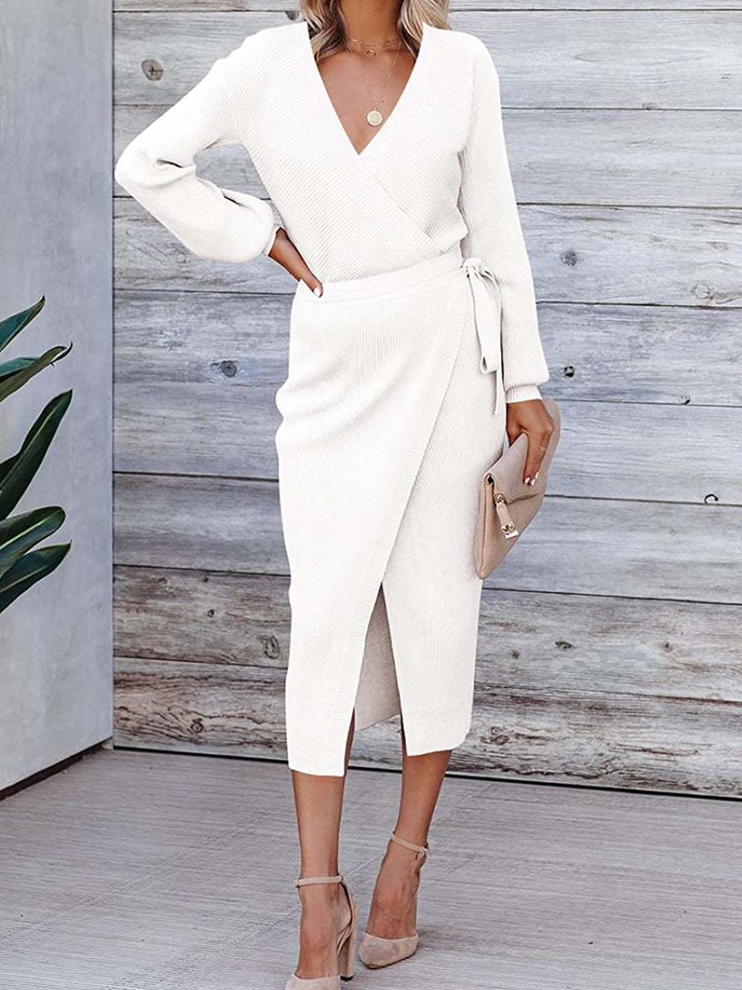 Introducing our white v-neck solid long sleeves bodycon polyester knee length dress, a stylish and versatile addition to your wardrobe. The white color adds a pop of vibrancy, making it a standout piece in any ensemble.
